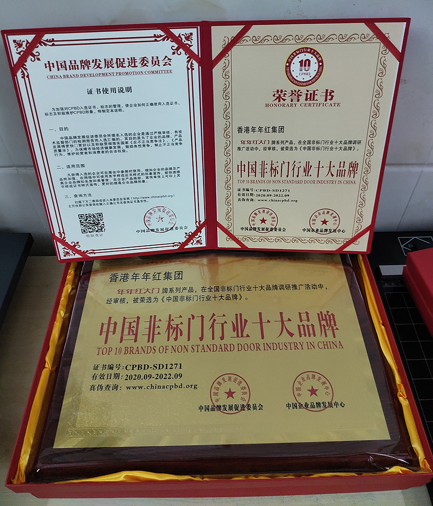 2004年:年年紅非標(biāo)門首家創(chuàng)新使用戶外轉(zhuǎn)印漆工藝,使非標(biāo)門戶外抗曬能力大大增強 |